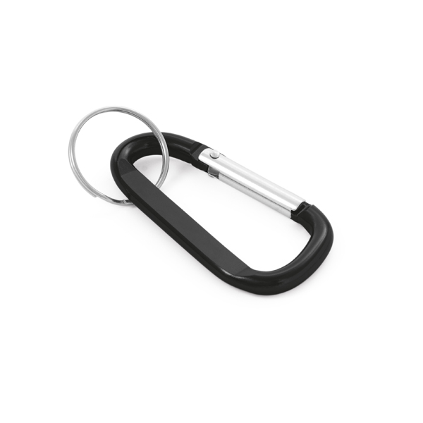 Mosquetão em alumínio, com argola porta-chaves e área plana para personalização. O mosquetão não é adequado para escalada