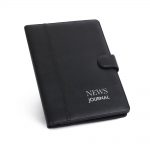 Pasta A4 em imitação de pele que inclui um bloco de 20 folhas pautadas e contém suporte para esferográficas (não incluída). Inclui calculadora dual-power de 8 dígitos com pilha LR1130 (incluída).