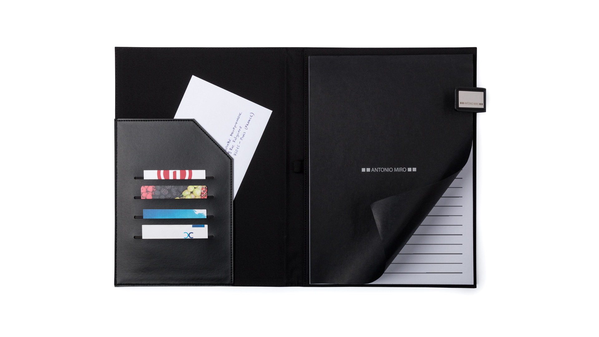 Pasta A4 Antonio Miró em elegante combinação de nylon 1200D e couro macio. Com fechamento magnetizado elegante com logótipo da marca e interior com bolso com aba, suportes para cartões e bloco de notas para 50 folhas com distribuição de listras. Apresentado numa elegante caixa preta com o logótipo da marca.