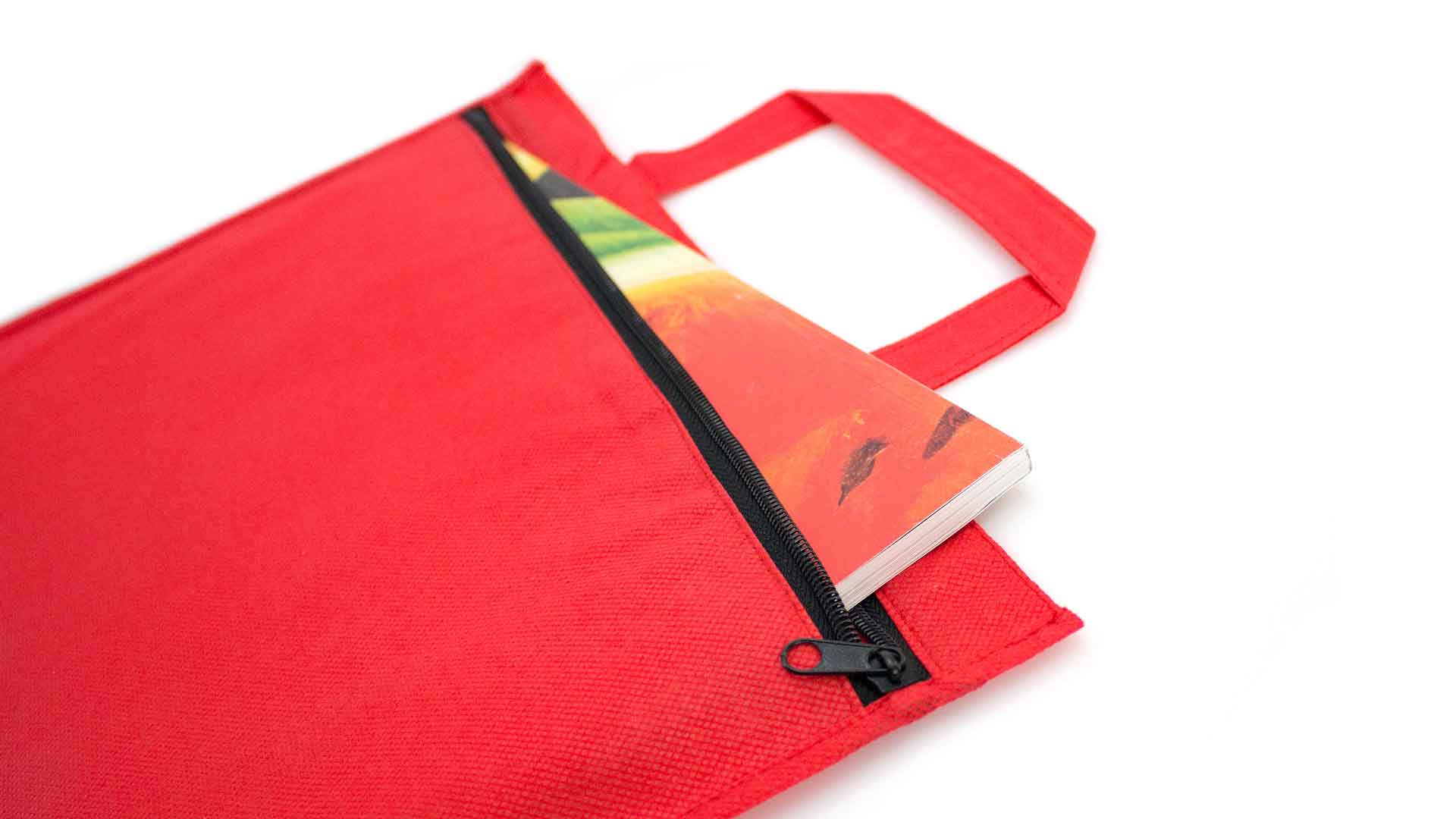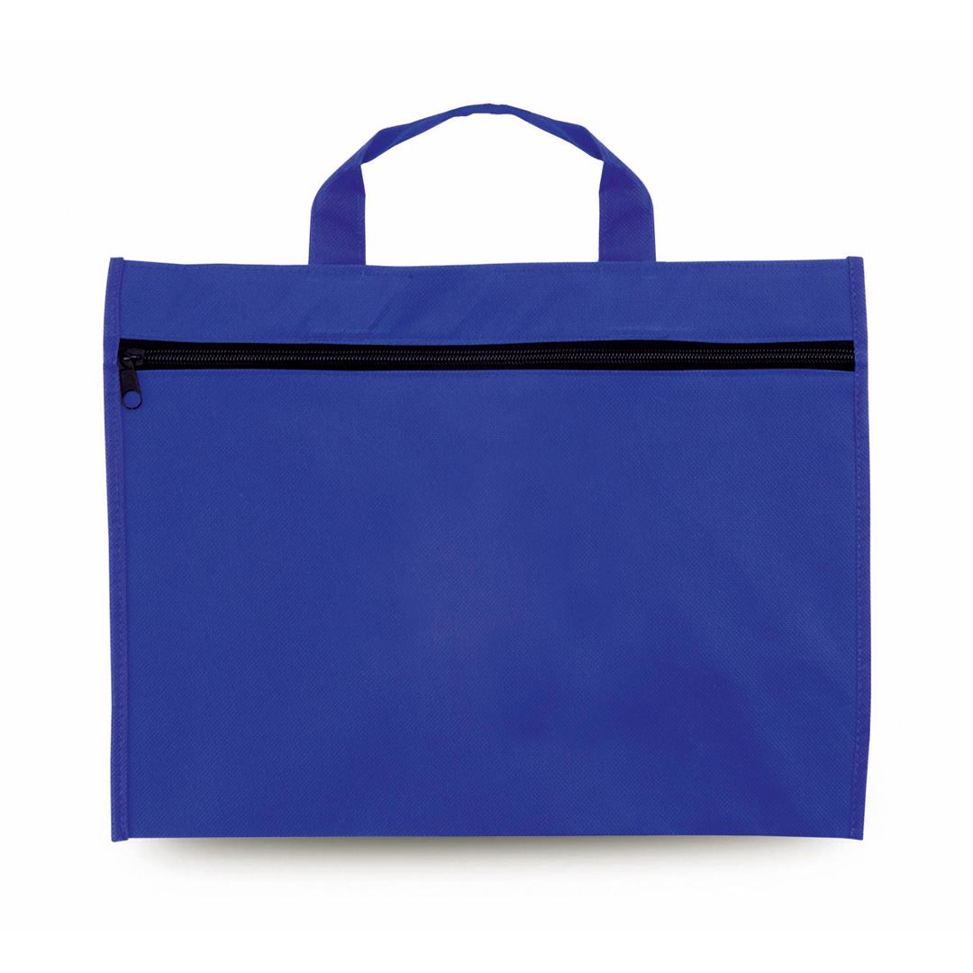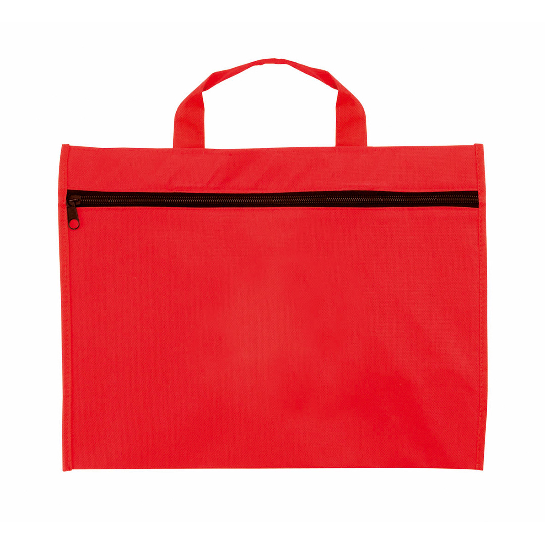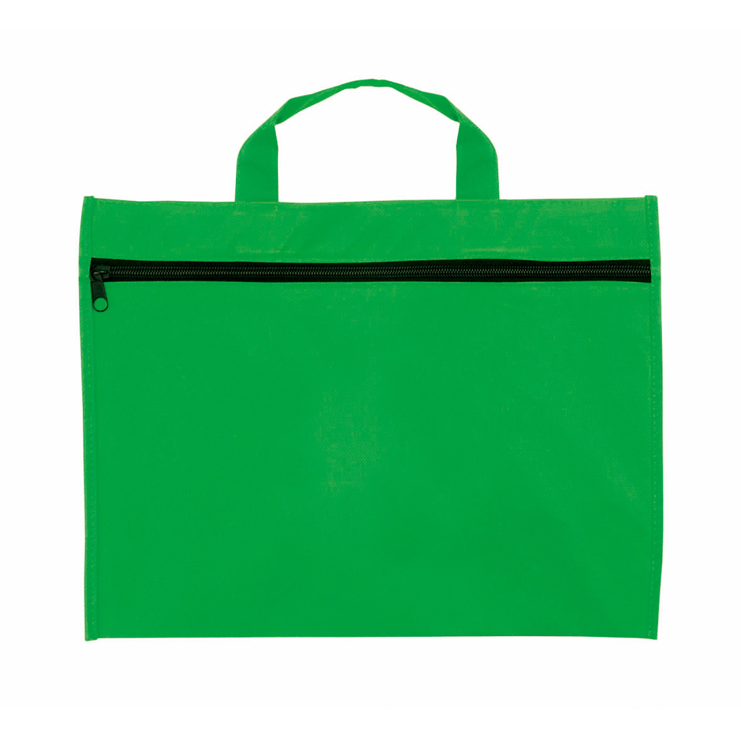 Porta-documentos com fecho de correr em material não tecido, colorido e com uma alça de transporte resistente.