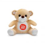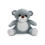Peluche em poliéster em formato de urso que contém área frontal adequada para personalização.