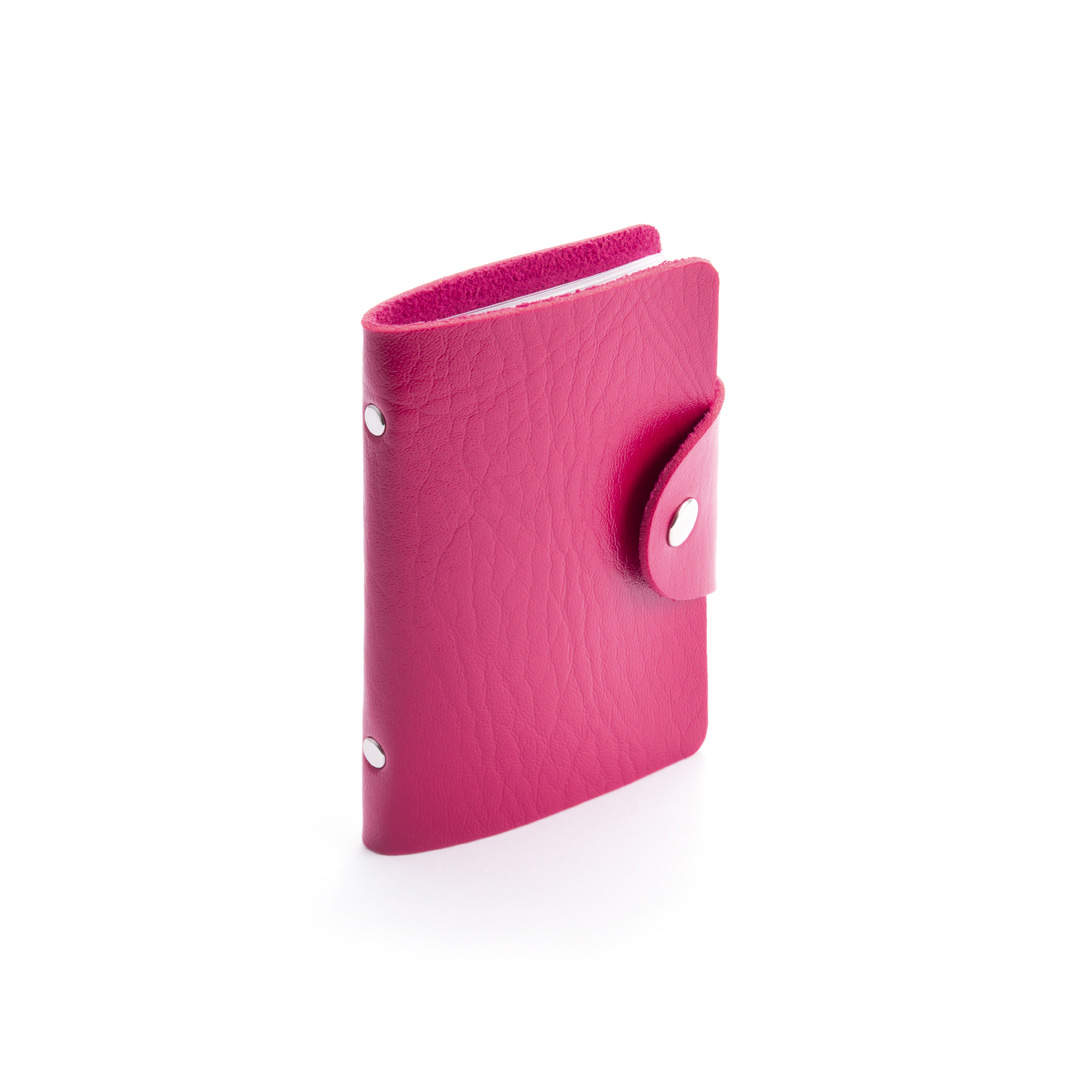 Porta-cartões com corpo em couro macio, com cores marcantes e fecho de metal. Com pinos de reforço de metal na coluna vertebral e 10 compartimentos internos em PVC transparente resistente.