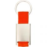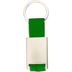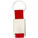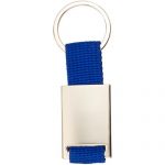 Porta-chaves de metal, retangular, com fita de nylon. Com uma argola metálica, e uma chapa de metal que permite uma área mais ampla de gravação.