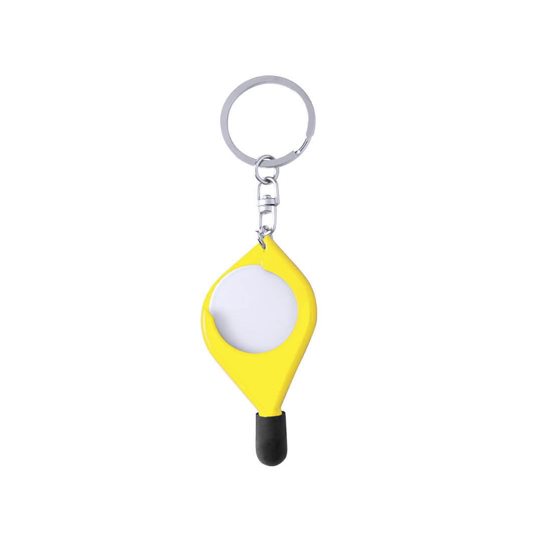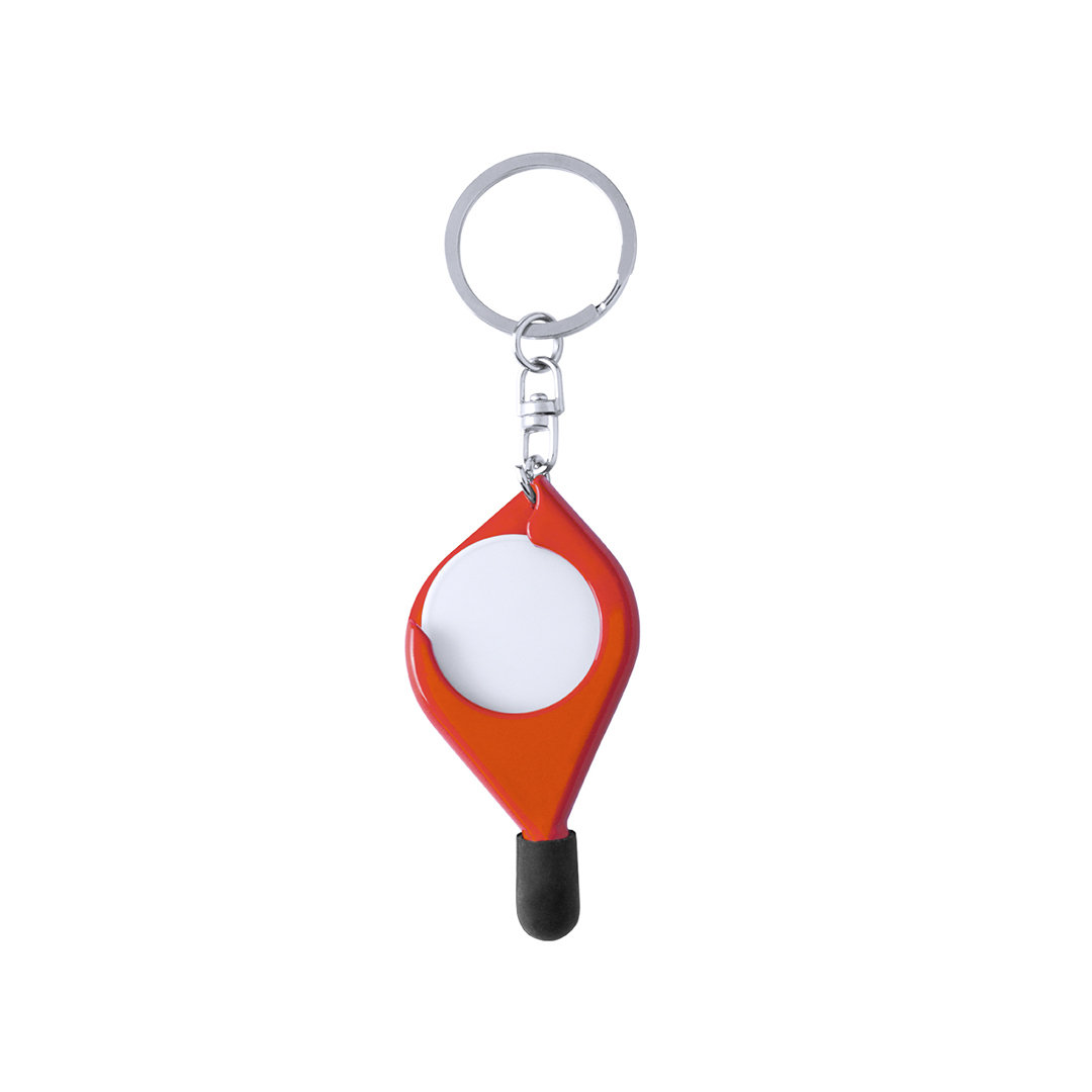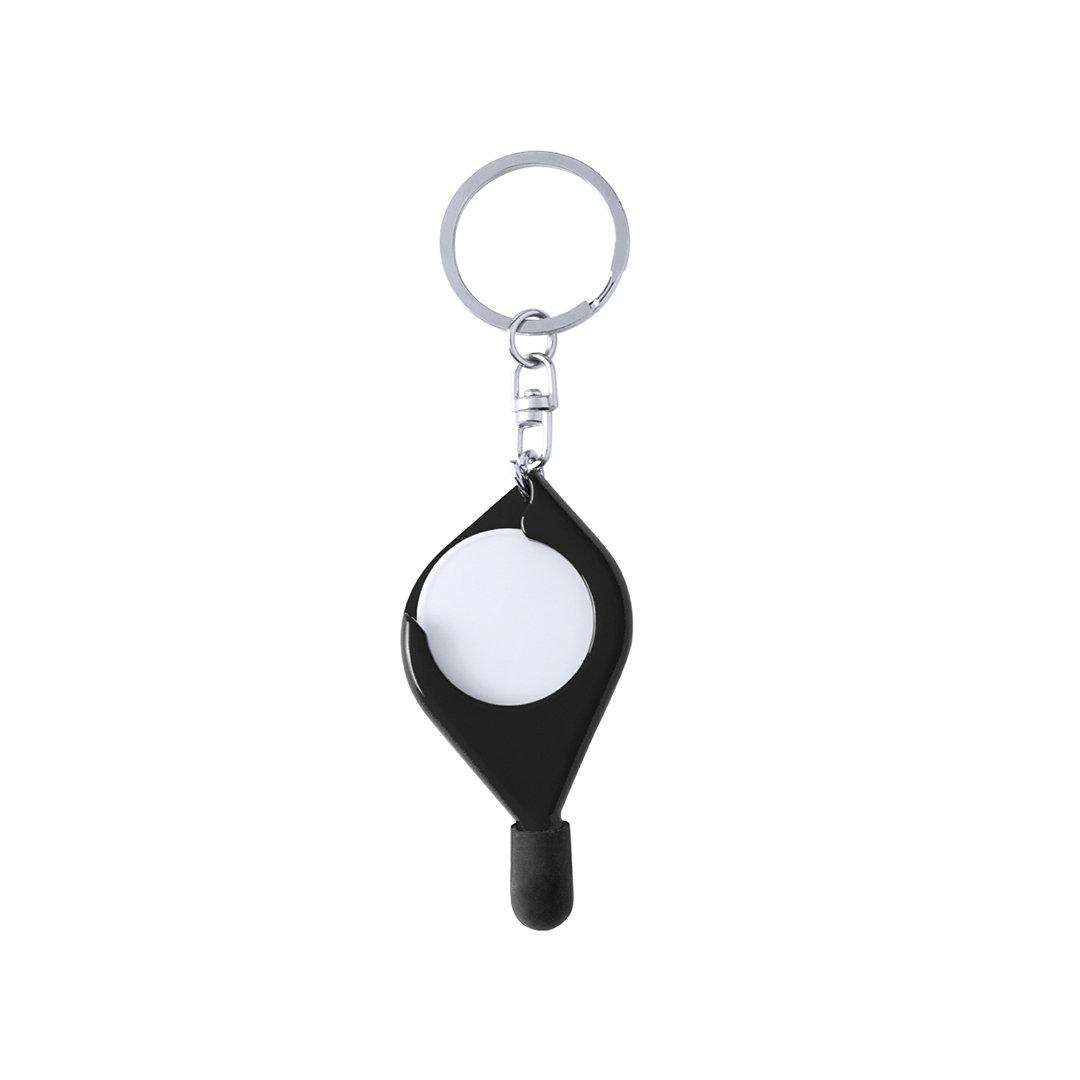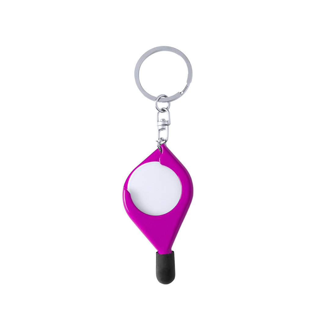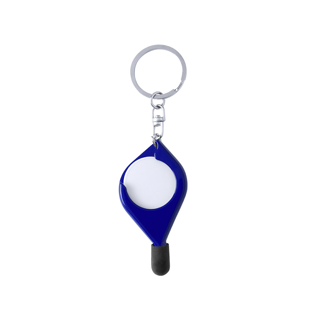 Porta-chaves ponteiro com moeda para carrinho de compras. Desenhado para fomentar a higiene e segurança em atividades quotidianas, como ir ao supermercado, bem como outras situações que requerem tocar superfícies comuns (ecrãs tácteis, teclados de multibanco e equipamentos para pagamento com cartão; elevadores...). Fácil de desinfetar após cada utilização e disponível numa gama de cores brilhantes, com moeda em cor branca.