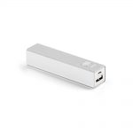 Bateria portátil em alumínio e com bateria de lítio. A bateria tem capacidade de 2.200 mAh e tempo de vida superior a 500 ciclos. Tem entrada/saída 5V/1A e inclui cabo USB/micro USB para carregar a bateria.