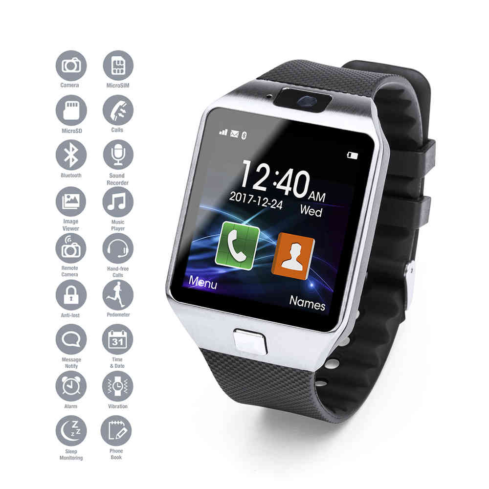 Relógio inteligente de design elegante, multi-funcional e multilingue, com câmera integrada, caixa de aço inoxidável, conexão Bluetooth® e recarregável via cabo USB - incluído -. Confortável cinta de silicone ajustável e tela LCD de 1,54 polegadas, tornam o dispositivo perfeito para todos os tipos de desportos, lazer e atividades do dia-a-dia. Resistente a salpicos. APP disponível para Android. Apresentado em uma atraente caixa de design.