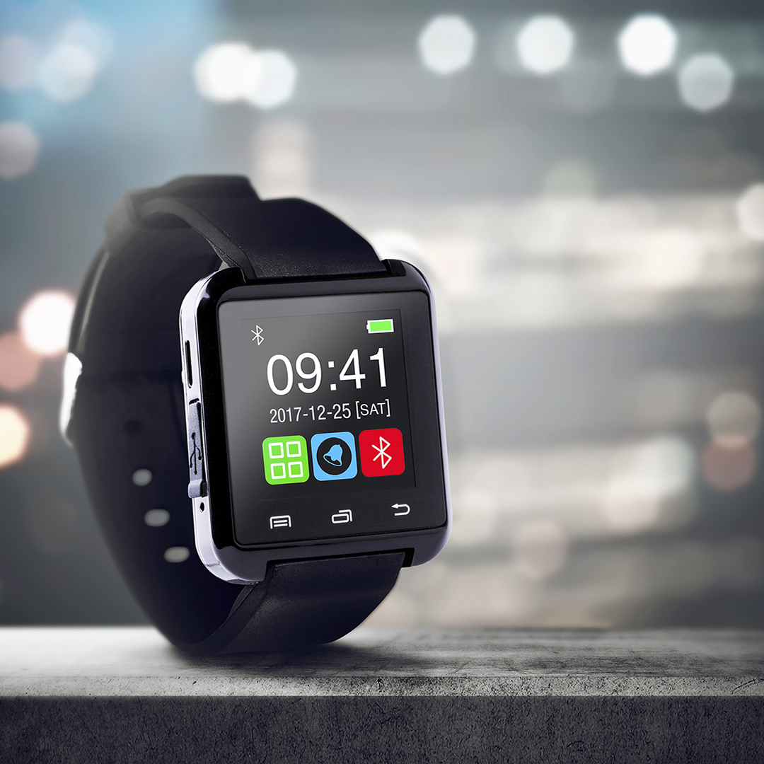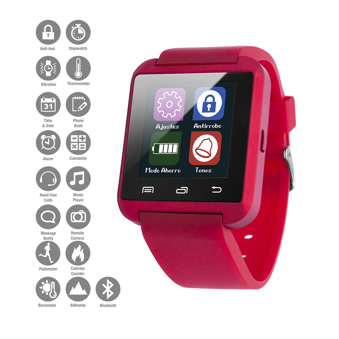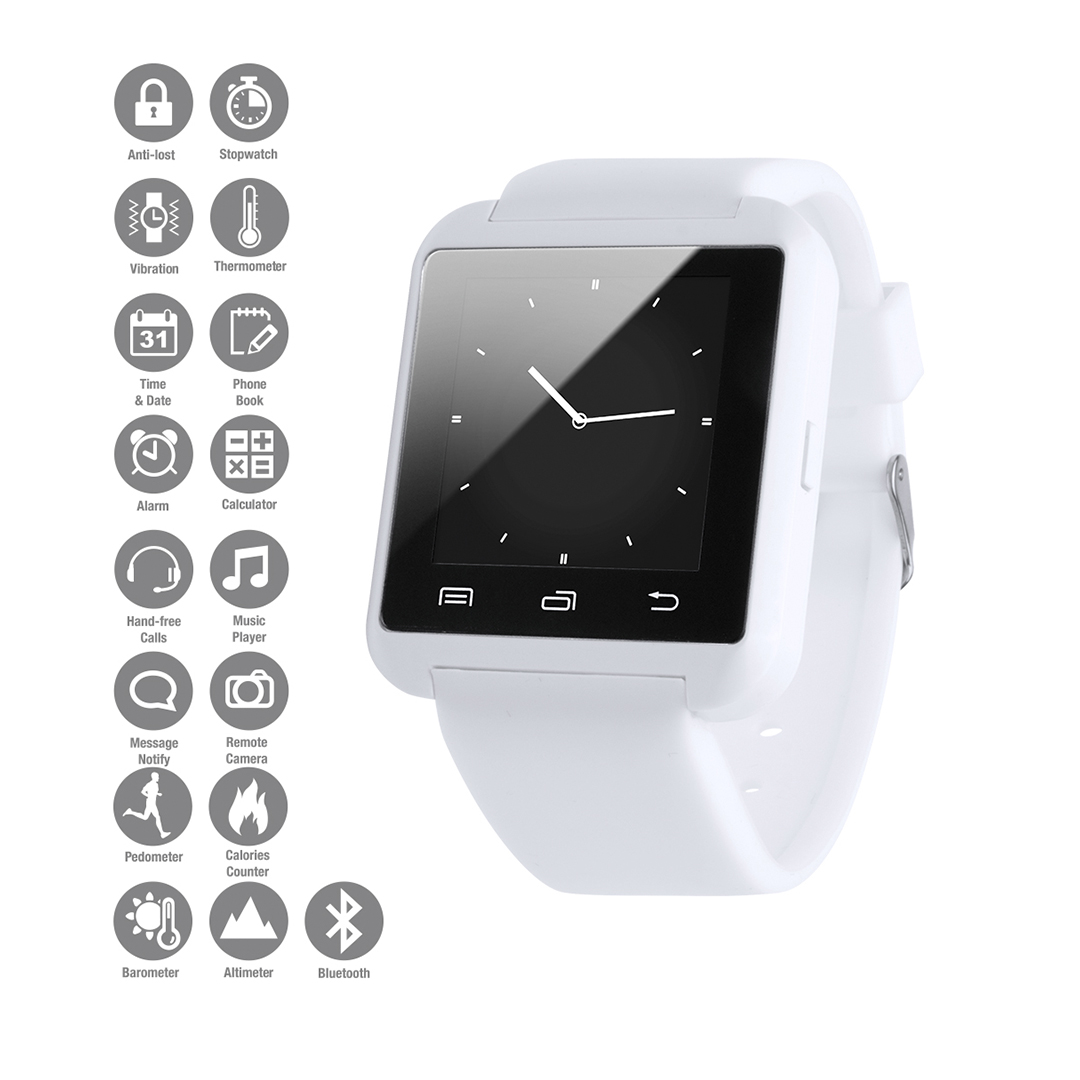 Relógio inteligente de design casual, multi-funcional e multilíngua com conexão Bluetooth® e recarregável via cabo USB - incluído -. Confortável cinta de silicone ajustável e tela LCD de 1,44 polegadas, tornam o dispositivo perfeito para todos os tipos de desportos, lazer e atividades do dia-a-dia. APP disponível para Android. Apresentado em uma atraente caixa de design.