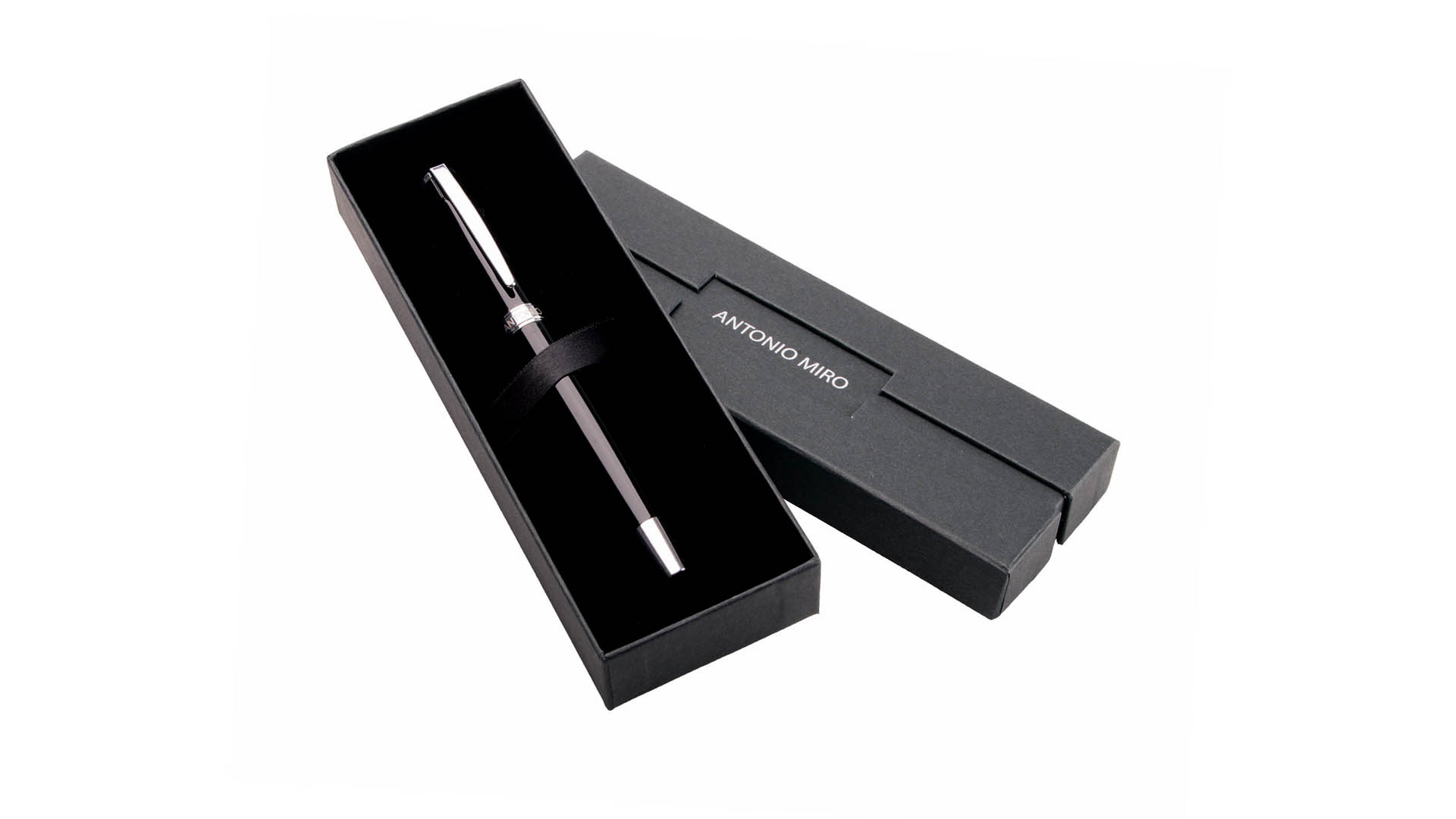 Roller Antonio Miró num elegante design bicolor e um corpo metálico macio em preto. Com o logótipo da marca no capuz, prenda e incline com um acabamento prateado brilhante. Apresentado num estojo individual em preto com o logótipo da marca. Em tinta azul.