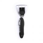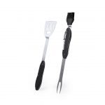 Conjunto prático de churrasco em material de aço inoxidável. Funções: saca-rolhas, cortador de cápsulas, garfo, remo, pincel e abre-latas.