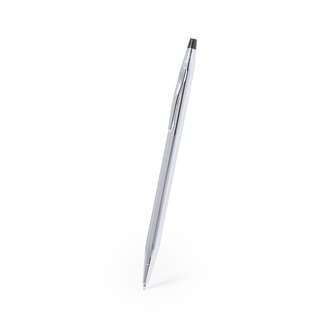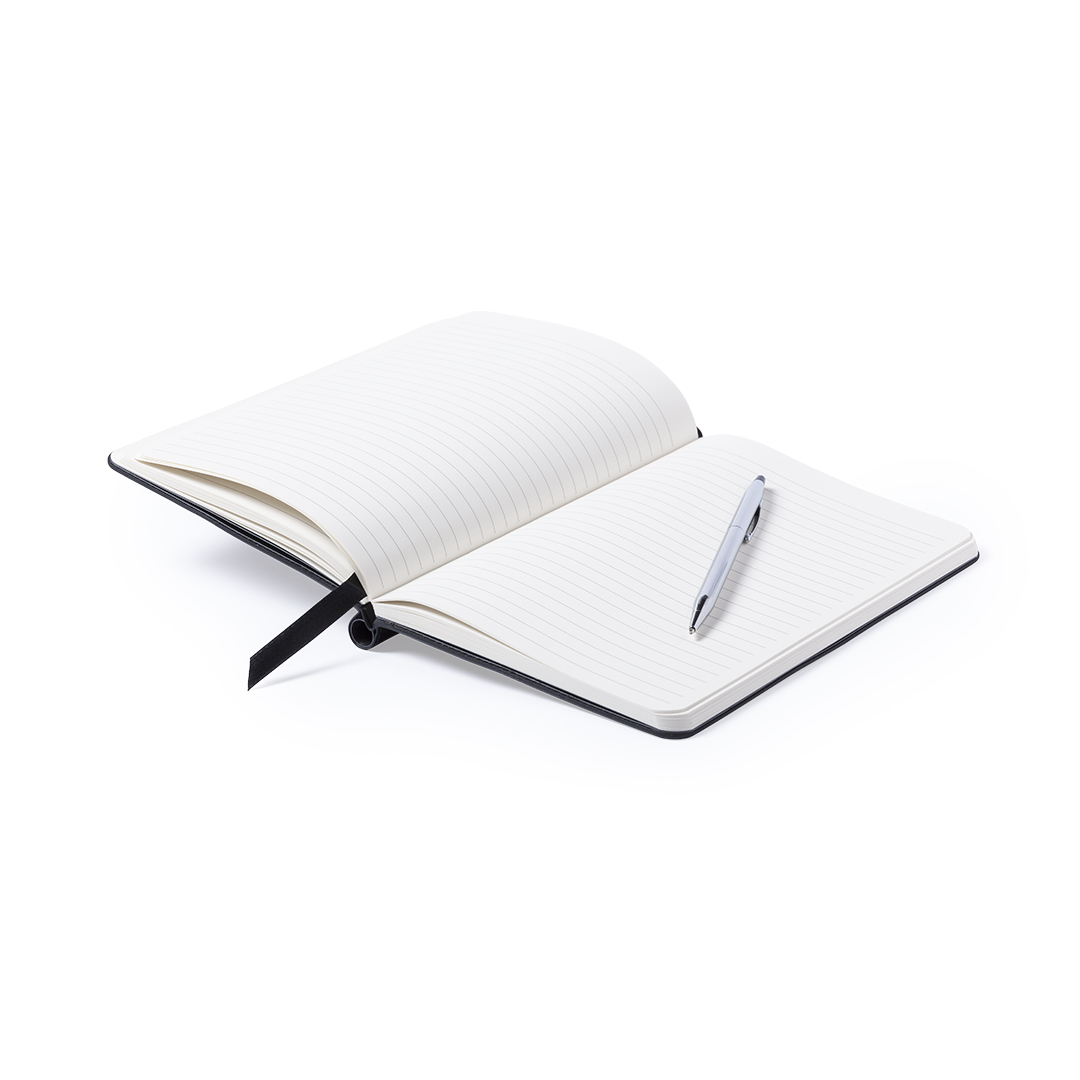 Conjunto com esferográfica e bloco de notas. Esferográfica rotativa em tinta preta e corpo de metal com um acabamento elegante em prata brilhante. Bloco de notas com capas de couro sintético com acabamento preto liso e 80 folhas com distribuição de listras. Apresentado num estojo individual com o logótipo da marca.