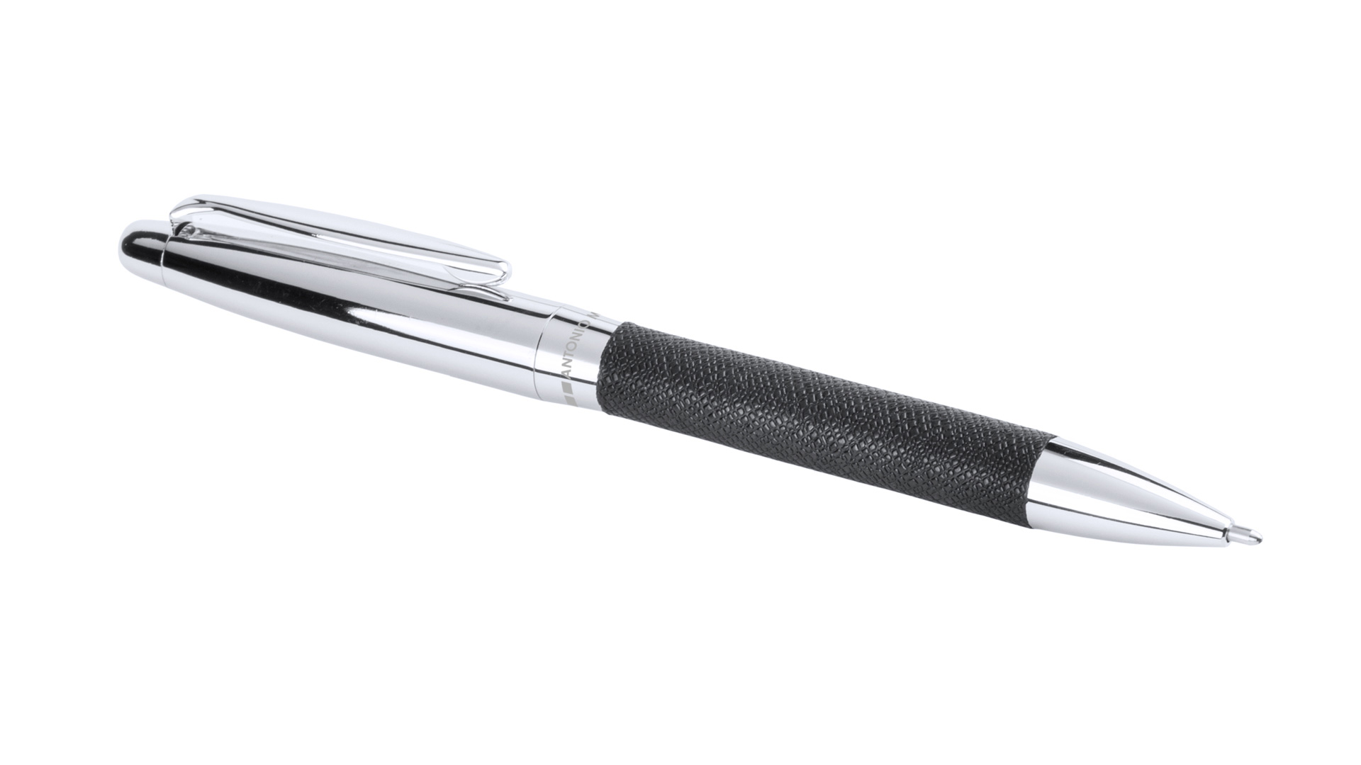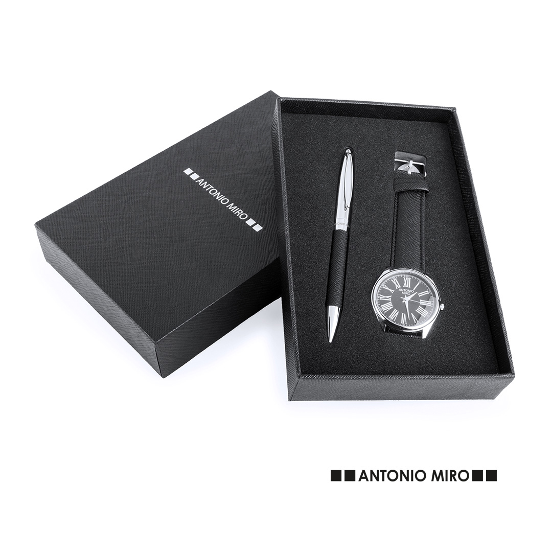 Elegante Set de Esferográfica & Relógio Antonio Miró. Esferográfica com corpo de couro com acabamento preto brilhante com acessórios prateados correspondentes e o logótipo da marca num anel central. Em tinta azul. Relógio sóbrio com o logótipo da marca no mostrador, caixa em aço inoxidável e pulseira de couro preta macia. Apresentado numa elegante caixa preta individual com o logótipo da marca, um interior em espuma macia e uma capa.
