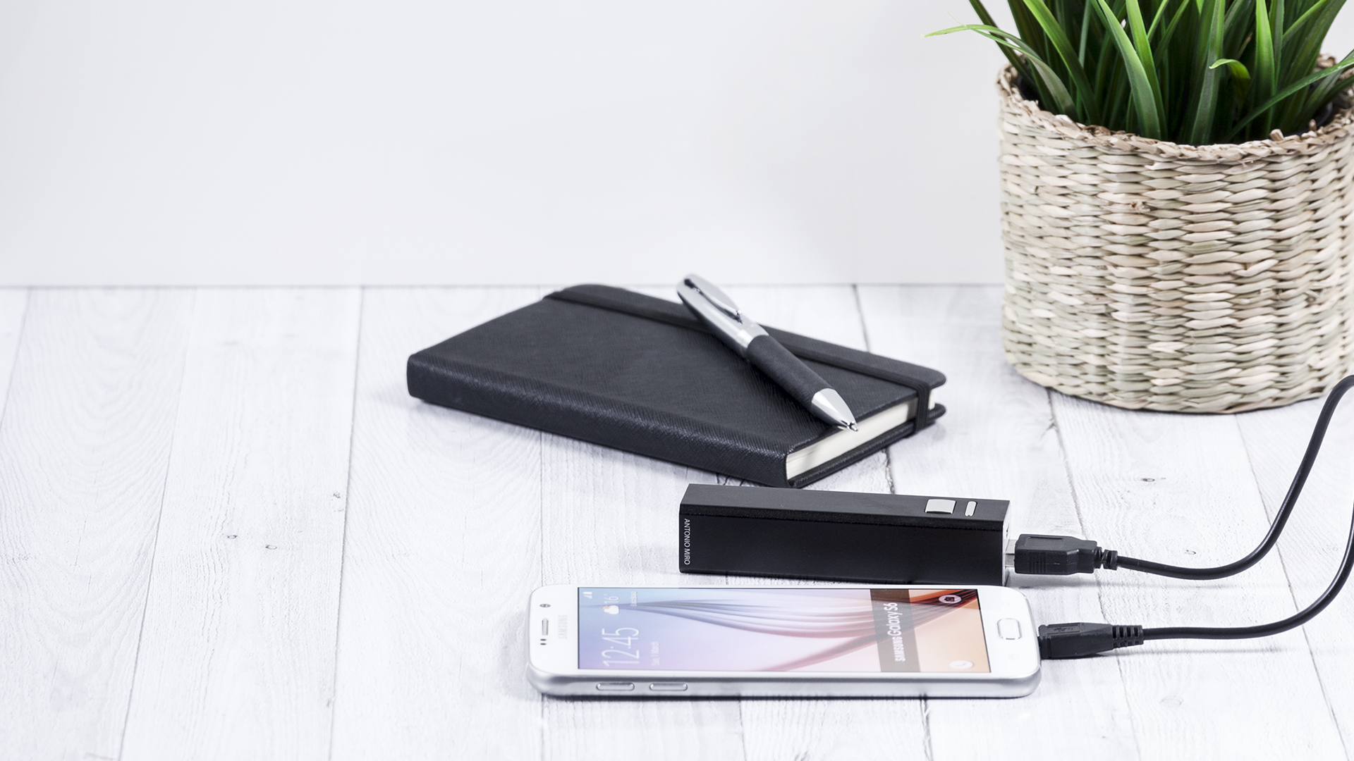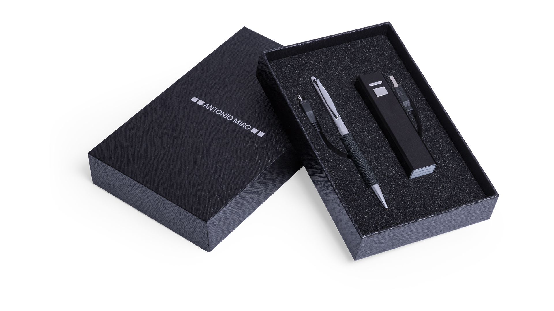 Powerbank 2.200 mAh em couro macio e esferográfica sóbria com corpo de couro da Antonió Miró, apresentada numa elegante caixa preta com o logótipo da marca. Com cabo micro USB. Caneta esferográfica em tinta azul.