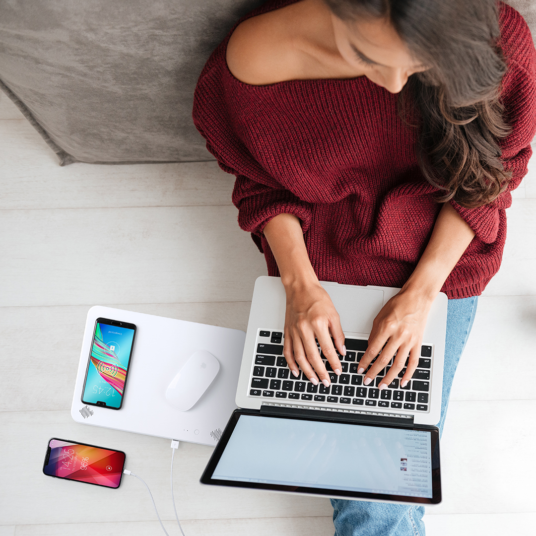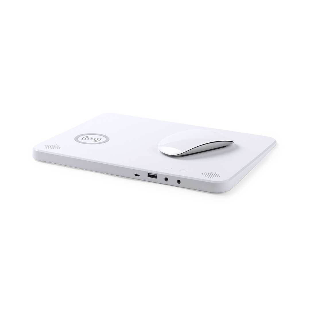 Tapete de rato multifuncional com carregamento sem fios, conexão Bluetooth®, colunas integradas e entrada de linha Jack até 3,5 mm. Em elegante design branco, com botão ON / OFF e indicador de estado de carga. Capacidade de carga de 4.000 mAh, com saída USB e recarregável via cabo micro USB - incluído -. Com duas colunas estéreo de 2W cada e função alta-voz. Superfície ampla para fácil impressão e apresentada em caixa de design atrativo.
