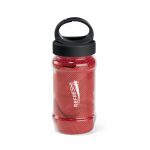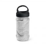 Toalha de desporto em poliamida e poliéster com embalagem em formato de garrafa. Garrafa em PP e PET. A toalha é refrescante e quando molhada permanece fria durante algumas horas. Se aquecer, basta abanar, reativando a sua frescura. Lavável na máquina de lavar roupa, tornando-se reutilizável. A garrafa tem gancho incluído. Capacidade até 440 ml.
