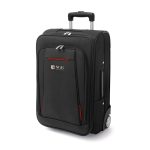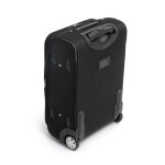 Trolley de viagem em 600D e EVA com compartimento frontal semi-rígido e interior forrado. Na parte posterior tem uma etiqueta para identificação. Pega extensível em alumínio, com mola. Trolley com capacidade até 28 L. Peso: 2,95 kg.