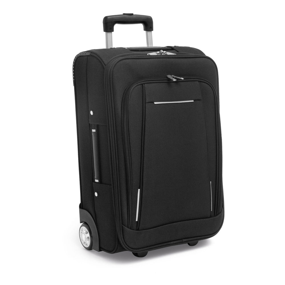 Trolley de viagem em 600D e EVA com compartimento frontal semi-rígido e interior forrado. Na parte posterior tem uma etiqueta para identificação. Pega extensível em alumínio, com mola. Trolley com capacidade até 28 L. Peso: 2,95 kg.