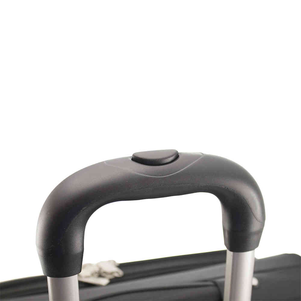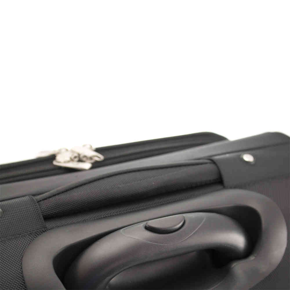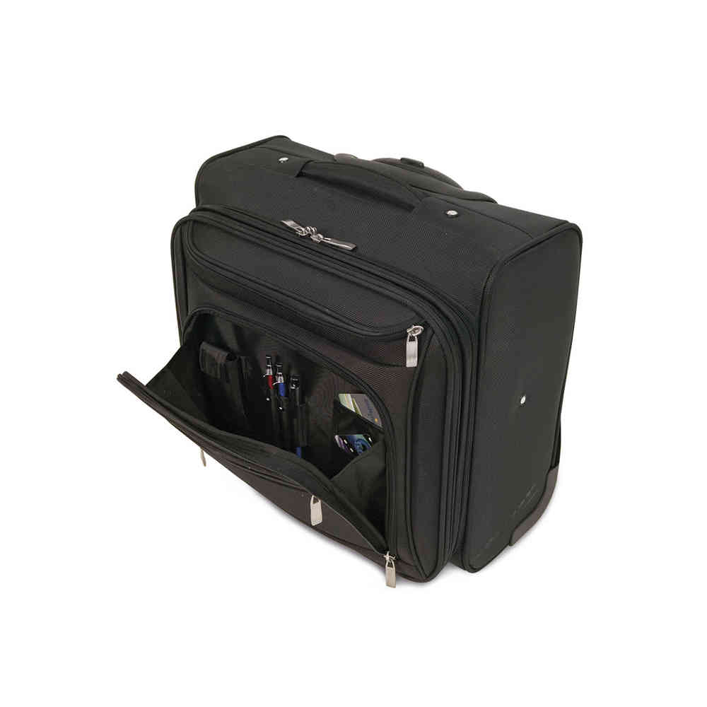 Trolley de Viagem com duas rodas e bolsos múltiplos, com acabamento em poliéster 1200D resistente. Preto elegante, com uma alça externa reforçada combinando, - incluindo- e bolsos frontais práticos. Com um identificador, trava de segurança combinada numérica e zíperes correspondentes, também inclui um compartimento interno acolchoado para um laptop de até 17 polegadas e uma infinidade de bolsos e capas para canetas internas.