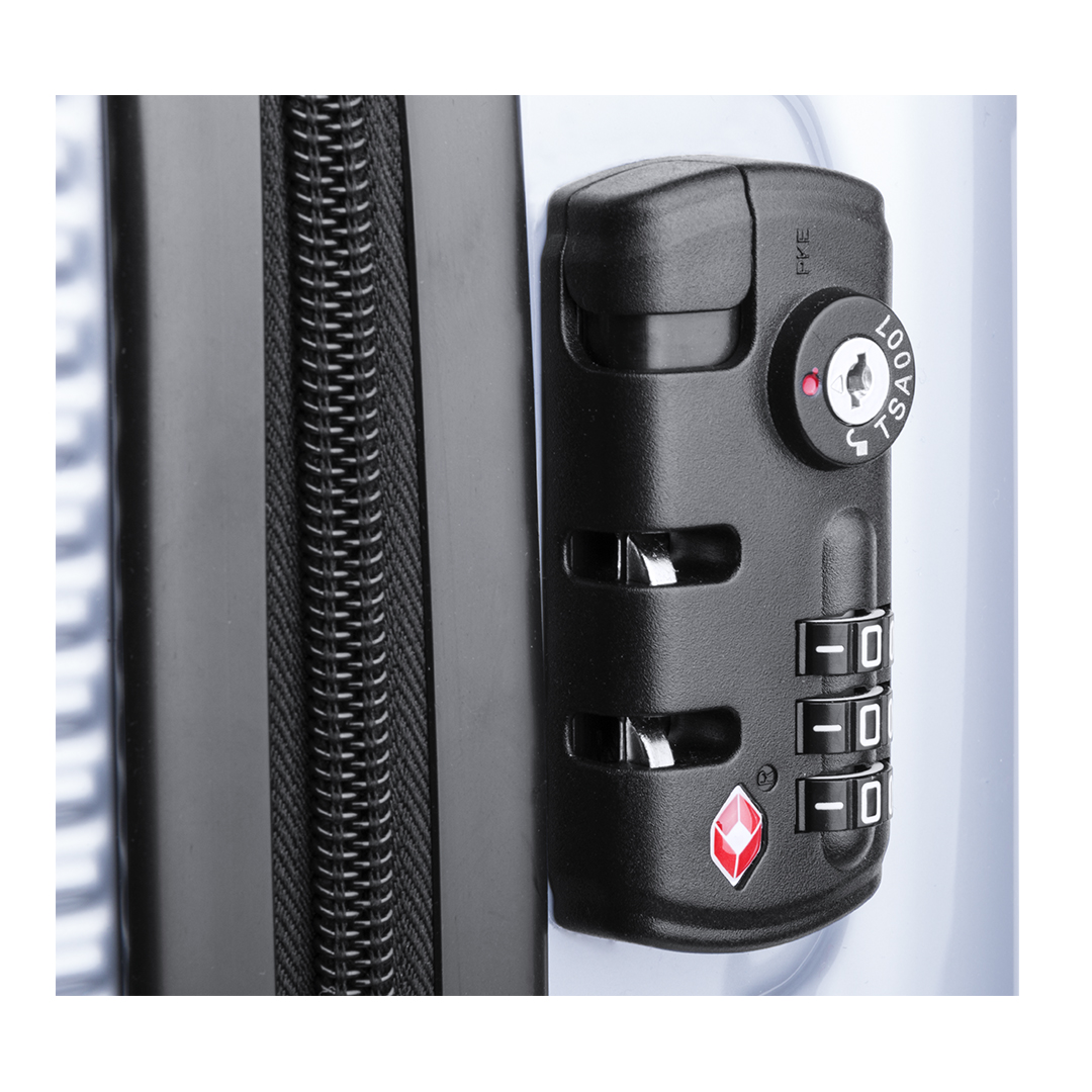 Trolley de Viagem rígido em material de acabamento prateado resistente. Abertura total, com 4 rodas e trava de segurança com senha. Fecho de acordo com as normas TSA - Transportport Security Administration -, que permitem às autoridades aduaneiras inspecionar o conteúdo da bagagem sem precisar forçar ou interromper o fecho, por meio de uma chave especial disponível para a autoridade. Compartimento principal com fecho de correr duplo puxador e pega de transporte dupla. Interior forrado com bolso para laptop acolchoado de até 17 polegadas.